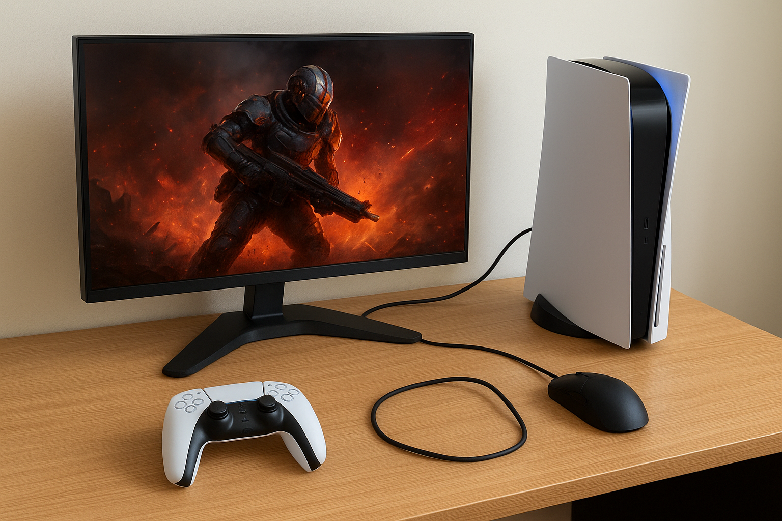 提案画像: デスク上に高リフレッシュレート対応ゲーミングモニターと、横に配置されたコントローラーやマウスが並ぶセットアップ